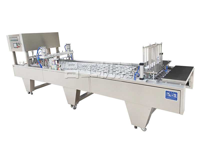 本機采用合理的機械傳動,功能齊全,灌裝、封口、切邊、制品推出,廢料收卷,印碼等自動化工作,可節(jié)約人力,降低成本。本機有二次熱封裝置,料杯/碗/盒與封膜經過前后二次熱封,封口牢固可靠。