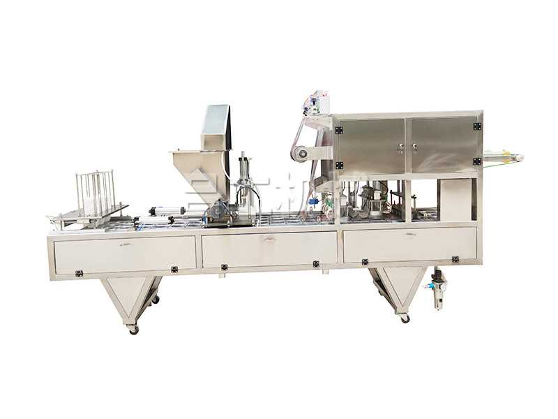 本機采用合理的機械傳動,功能齊全,灌裝、封口、切邊、制品推出,廢料收卷,印碼等自動化工作,可節(jié)約人力,降低成本。本機有二次熱封裝置,料杯/碗/盒與封膜經(jīng)過前后二次熱封,封口牢固可靠。