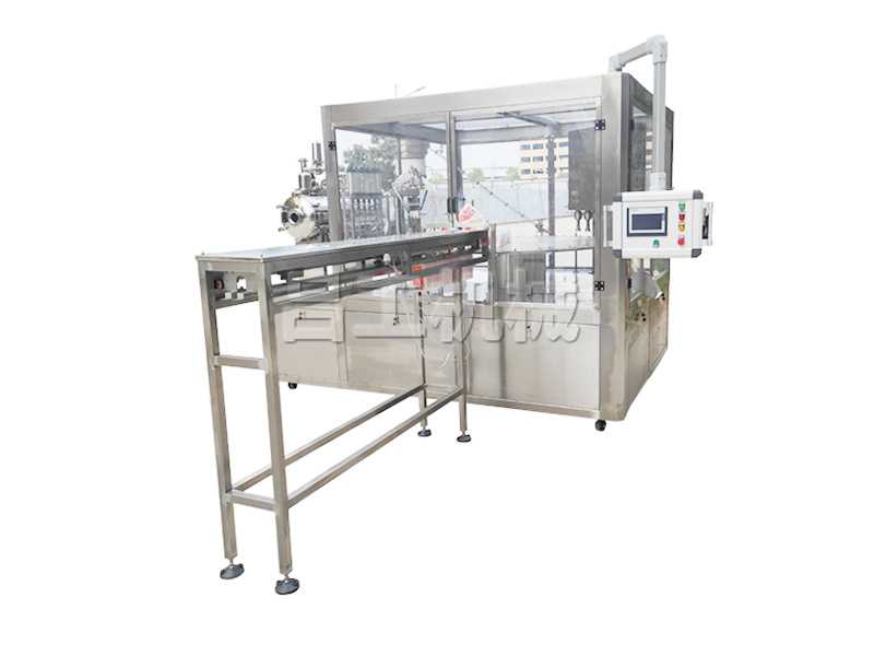 特點:本機從自動定位—自動吹氣—自動定量兩次灌裝—自動清洗—自動下蓋—自動旋蓋—自動出袋